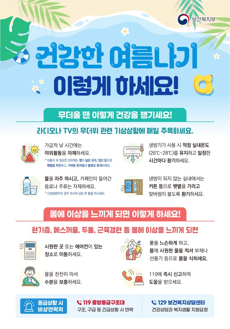 이 외에도 예방적 관리를 위해 폭염 대비 행동요령 및 건강수칙 포스터를 경로당, 노인복지관 등에 전달하였고, 홍보물품을 통해 어르신들에게 건강관리 안내를 강화하고 있다.