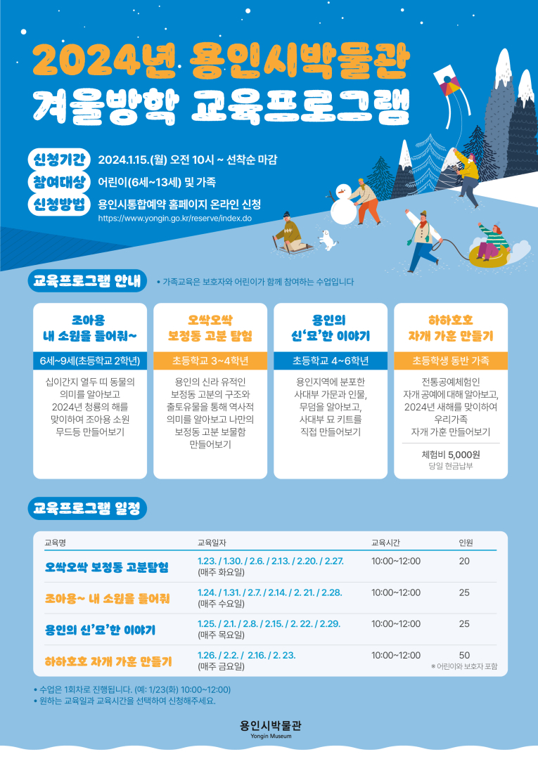 박물관 측은 ‘2024년 용인시박물관 겨울방학 교육프로그램’을 운영하기로 하고 오는 15일부터 참가자를 선착순으로 모집한다고 3일 밝혔다.